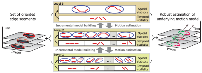 We incrementally generated a part-based description by grouping simple local features (edge segments) to part combinations. This part-based representation is built from a large set of features (edge segments) by hierarchically grouping them depending on their spatial and temporal density. The grouping process leads to a set of stable part combinations with increasing complexity, which can efficiently guide a spatio-temporal association step (find correspondences) of coherently moving image regions, which are part of the same target object (see Figures 2 and 3). Figure 1 visualizes the concept of the approach. Videos 1 and 2 show tracking results with this generic, but also highly target specific representation. Related publications [28,39] (see publications).
